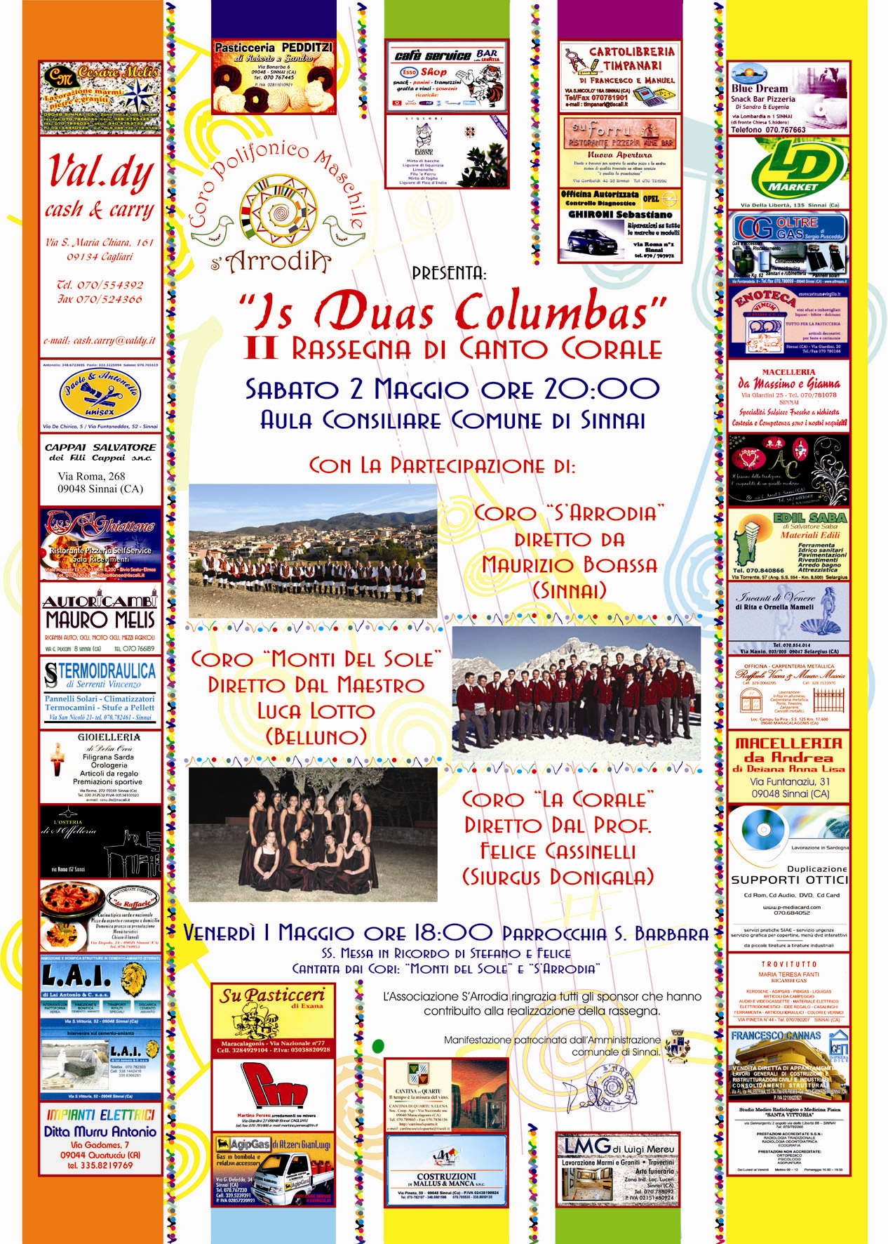 Il 1° maggio ha visto i due cori impegnati nel cantare la messa, celebrata da Don Abis nella Chiesa di Santa Barbara, in suffragio di Stefano e Felice ed il giorno successivo si è svolta la rassegna presso l’aula consiliare del Comune di Sinnai.
