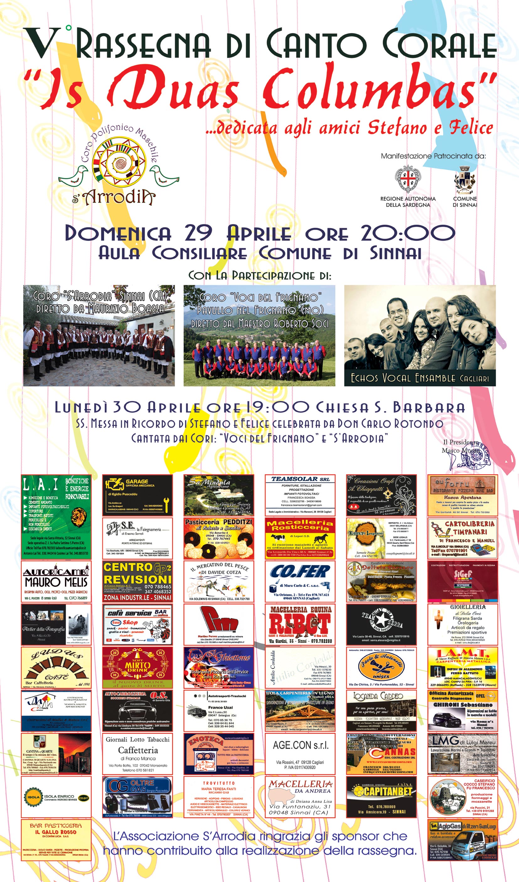 La serata si è chiusa, dopo il consueto scambio di doni e saluti ai quali ha preso parte anche il nostro Sindaco, con un canto eseguito da tutti e tre i Cori: Signore delle cime. In realtà la parte canora della manifestazione ha avuto un ulteriore epilogo l’indomani nella Chiesa di Santa Barbara, dove si è celebrata una Messa in suffragio di Stefano e Felice, animata da “S’Arrodia” e dal “Voci del Frignano”.