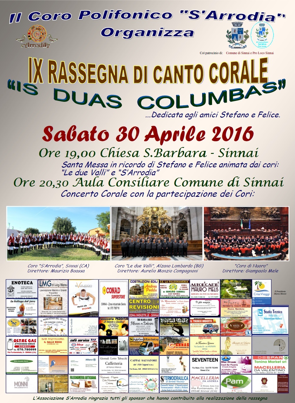 Come da programma il giorno 30 aprile 2016 ha avuto luogo, presso l’aula consiliare del Comune di Sinnai, la 9^ edizione della rassegna corale denominata “Is Duas Columbas”, dedicata agli amici Stefano Boassa e Felice Schirru scomparsi nel 2007, ed organizzata dalla nostra Associazione. Oltre S’Arrodia, hanno fatto parte della manifestazione il Coro “Le Due Valli” di Alzano Lombardo, centro a pochi chilometri da Bergamo con il quale abbiamo stretto l’ennesimo gemellaggio, ed il Coro di Nuoro, primo in assoluto ad aver proposto il canto popolare sardo con coro a quattro voci. Come ormai consuetudine, la manifestazione è stata anticipata dalla Santa Messa celebrata in ricordo di Stefano e Felice, presso la Parrocchia di Santa Barbara, ed è stata animata dai Cori S’Arrodia e Le Due Valli.