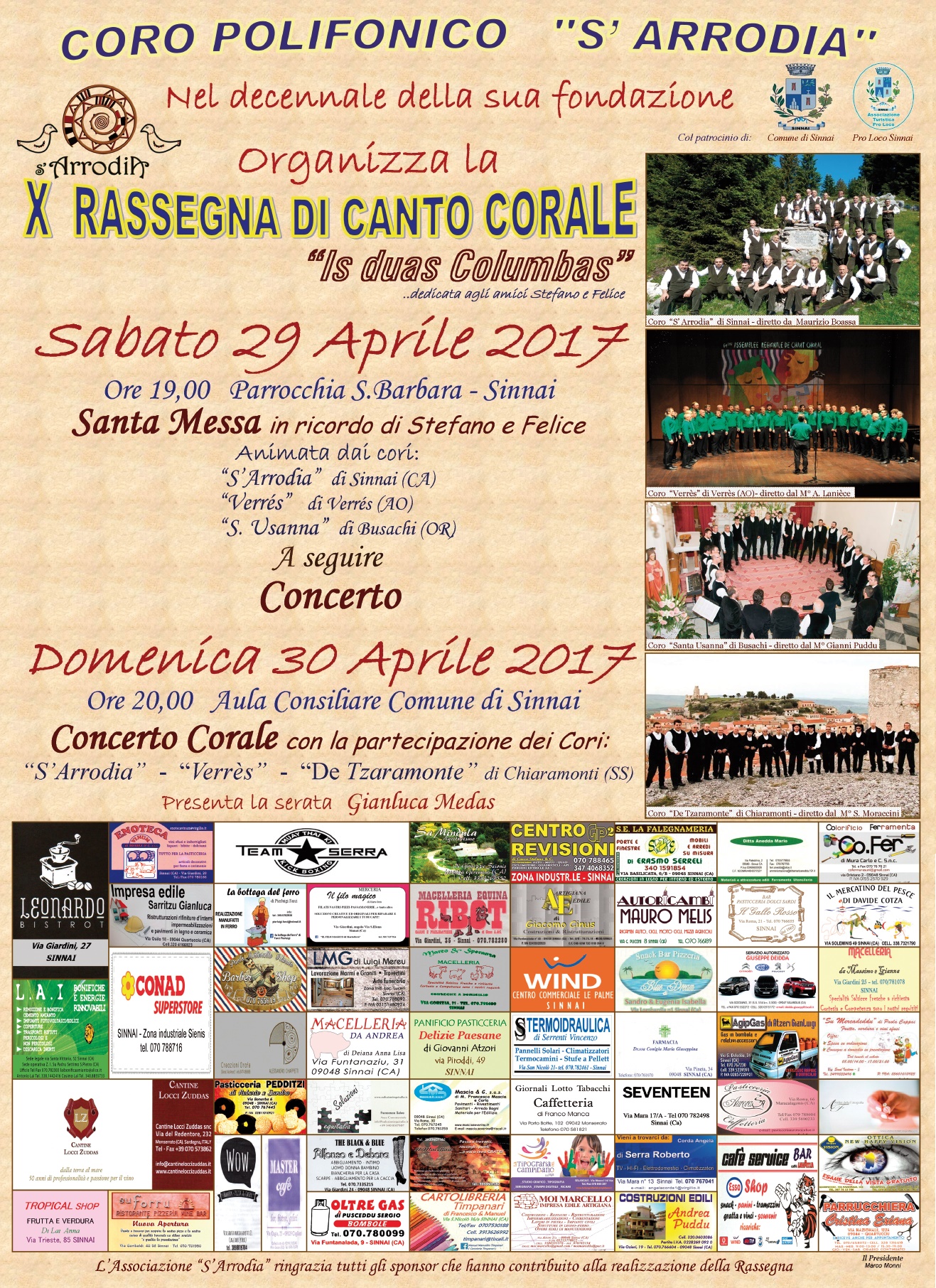 Questa edizione, in quanto 10^, si è svolta in due giornate: la prima sabato 29 aprile presso la Chiesa di Santa Barbara in Sinnai, è iniziata con la Santa Messa in suffragio dei nostri amici, in compagnia dei Cori di Verrès (AO) e Santa Usanna di Busachi (OR) che, dopo averne animato la celebrazione unitamente a S’Arrodia, hanno dato vita ad un concerto di brani sacri. Grazie alla meravigliosa acustica della Chiesa ed al tema dei brani proposti, si è rivelata una serata davvero ricca di emozioni.