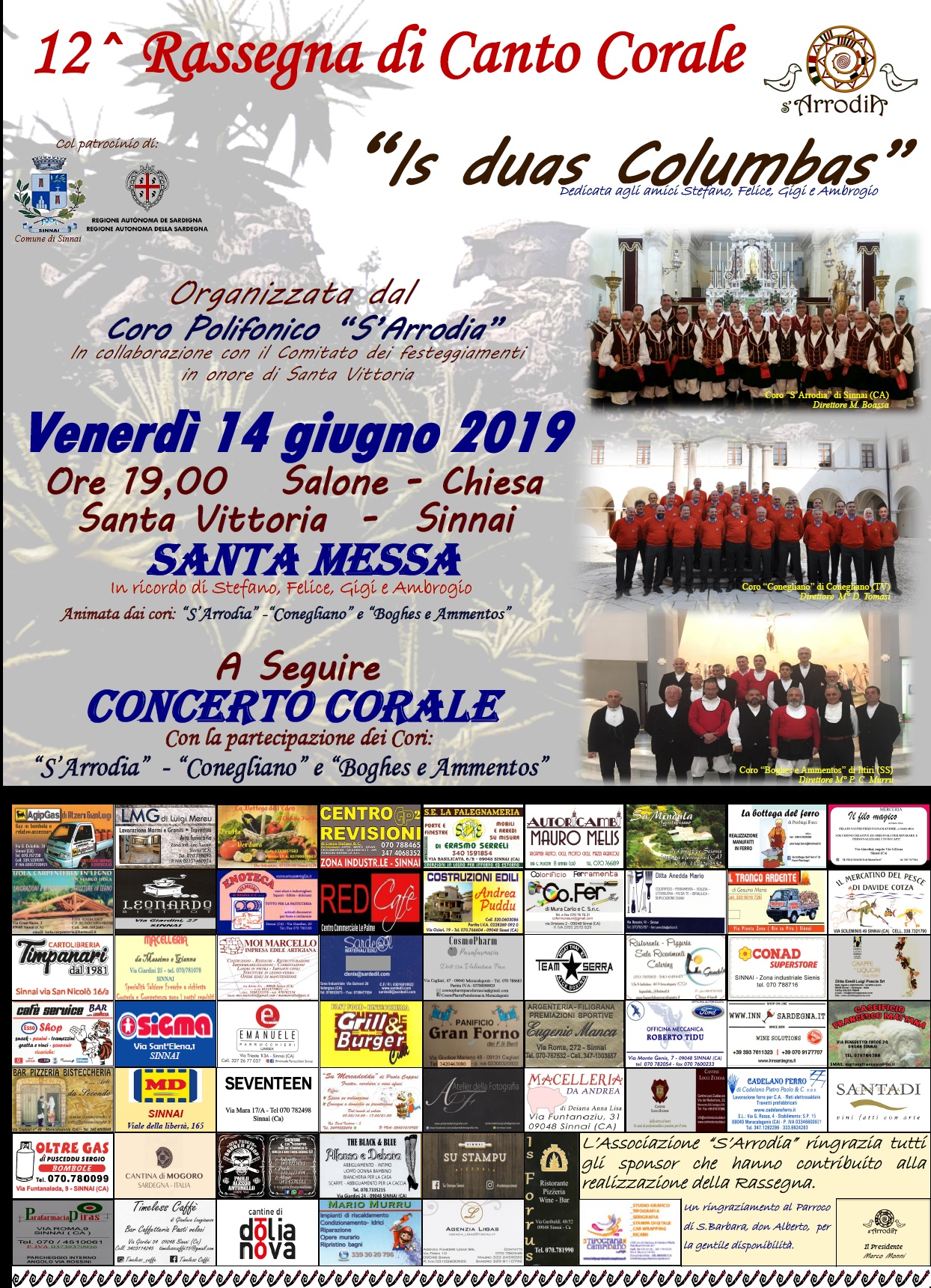 Al termine della messa il Coro S’Arrodia ha aperto la rassegna con il consueto "Is Duas Columbas" e ha chiuso la propria esibizione, dopo altri due brani del proprio repertorio classico, con un inedito "Oh Giovoneddu ascurta", musicata e armonizzata dal nostro Direttore Maurizio Boassa e scritto da un nostro concittadino, Ugo Tremulo, il quale non ha potuto partecipare alla serata per le sue precarie condizioni di salute che lo porteranno in breve tempo alla sua dipartita, altro grave lutto per la nostra comunità.