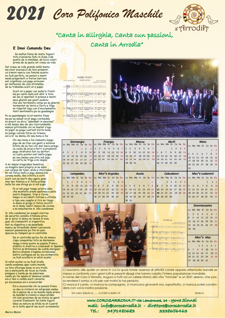 Il Coro S’Arrodia è fortemente attivo soprattutto nell’ambito della propria Comunità, partecipa sempre volentieri, dove invitato, alle iniziative delle numerose Associazioni Sinnaesi.